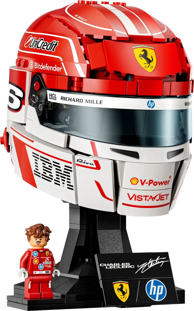 The set includes a Charles Leclerc minifigure and a printed plaque bearing his signature, adding extra appeal for Formula 1 enthusiasts. Once assembled, the helmet becomes an impressive display piece measuring 18 cm high, 11 cm wide and 13 cm deep.
