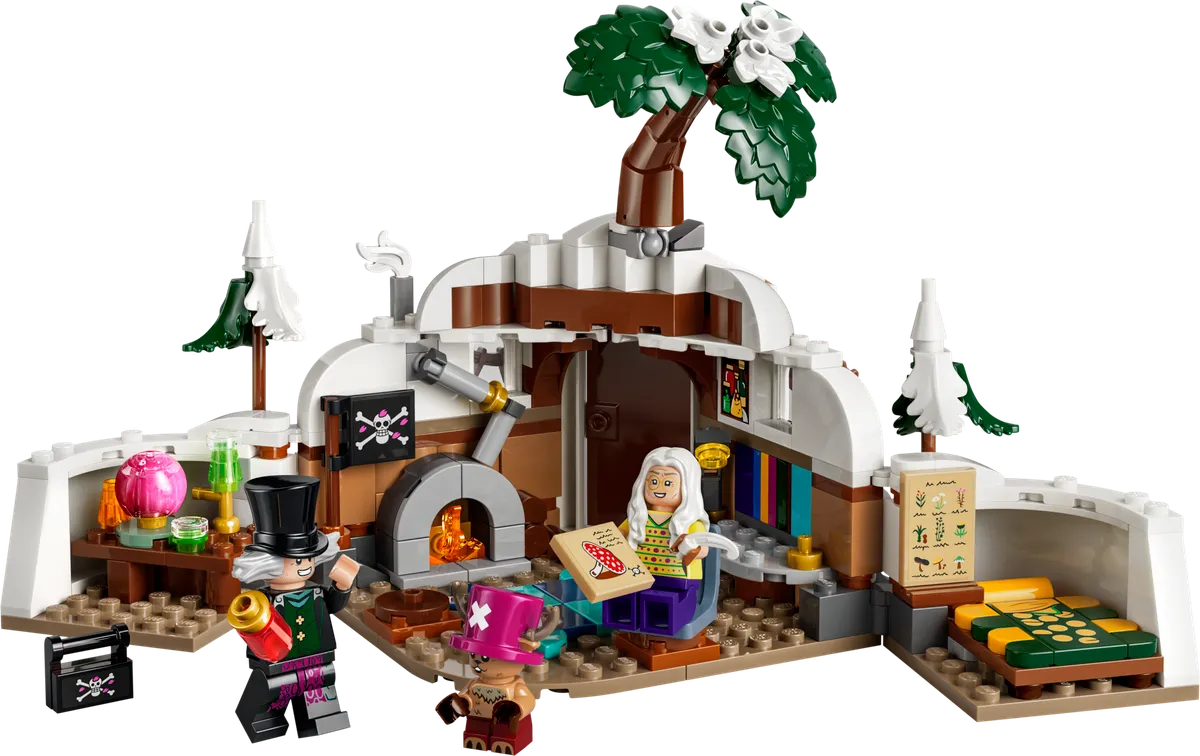 The set includes three minifigures: Tony Tony Chopper wearing his signature antler hat, Dr. Hiriluk with his characteristic headwear, and Dr. Kureha. When opened, the mountain reveals an expansive interior filled with the healer's equipment and personal belongings.