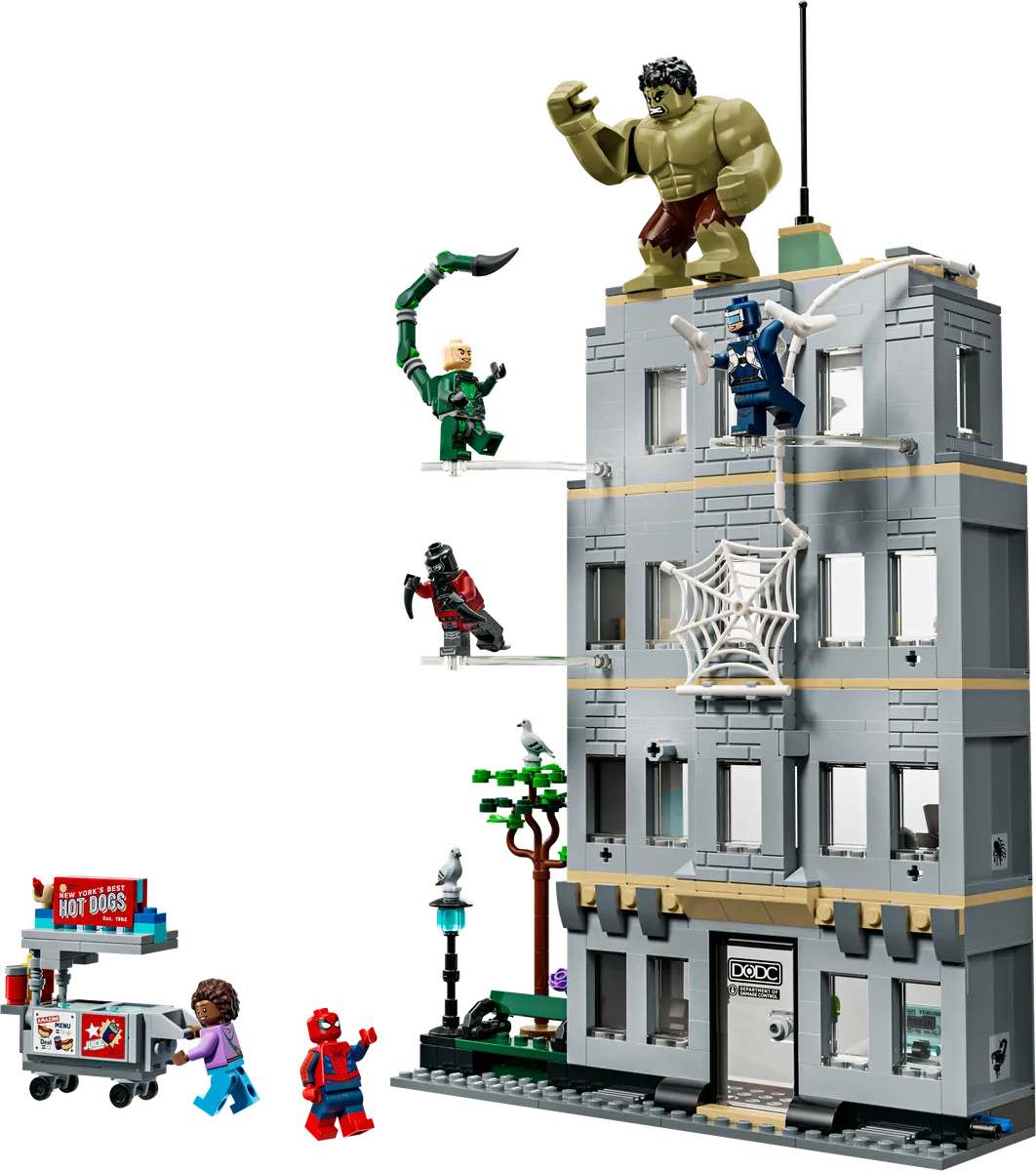 Spider-Man vs. Hulk Epic Clash features 534 pieces that build into a modular city scene measuring 36 cm high, 24 cm wide and 13 cm deep. The set recreates a dramatic Super Hero showdown inspired by Spider-Man: Brand New Day, complete with a destructible building facade and detailed street environment.