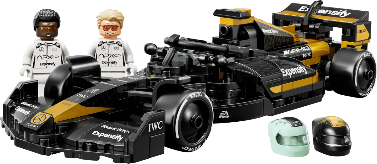Featuring a distinctive black and gold livery inspired by the APXGP Team from F1 The Movie, this 268-piece Speed Champions set recreates the film's racing car with authentic sponsor decals and Pirelli-branded rear tyres. The model measures 20 cm long, 7 cm wide and 4 cm high, making it an ideal display piece for desks or shelves.